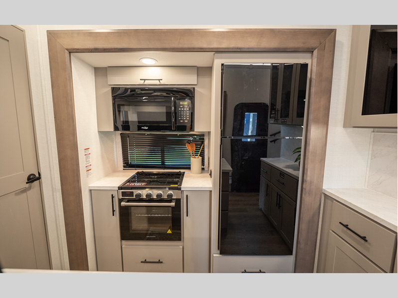 The 101" wide-body benchmark chassis provides plenty of space to bring along the dirt bikes, four-wheeler, or kayaks, and the Azdel-backed fiberglass sidewalls are ultra durable so you can enjoy your RV for years to come. You will appreciate the Garage Management System that includes a weather resistant ramp door, a fully insulated garage floor, and a multi-point tie-down system to keep your toys secure during transport. The interior will have you feeling at home with black cabinetry hardware, residential LED recessed ceiling lights, a large residential shower, and many more comforts.