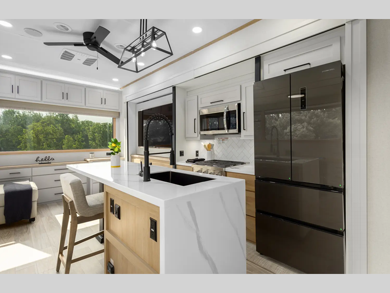 Sleeps 8 Slides 4 Length 42 ft 9 in Ext Width 8 ft Ext Height 13 ft 4 in Int Height 7 ft Hitch Weight 2010 lbs GVWR 15500 lbs Dry Weight 12609 lbs Cargo Capacity 2891 lbs Fresh Water Capacity 50 gals Grey Water Capacity 100 gals Black Water Capacity 50 gals Furnace BTU 40000 btu Number Of Bunks 1 Available Beds King Refrigerator Type 12V Refrigerator Size 16 cu ft Cooktop Burners 3 Number of Awnings 1 Axle Weight 7000 lbs LP Tank Capacity 30 lbs Water Heater Type On Demand Tankless AC BTU 30000 btu TV Info LR 50" Flat Screen Smart TV Awning Info 10' 8" and 20' Electric with LED Light Strip Axle Count 2 Washer/Dryer Available Yes Number of LP Tanks 2 Shower Type Standard Electrical Service 65 amp Similar Floorplans