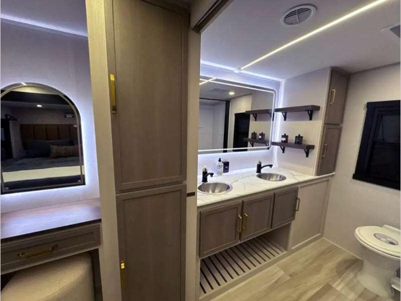 Sleeps 4 Slides 2 Length 35 ft Ext Width 8 ft Ext Height 11 ft 5 in Int Height 0 ft Hitch Weight 915 lbs Dry Weight 8433 lbs Cargo Capacity 1282 lbs Fresh Water Capacity 45 gals Grey Water Capacity 60 gals Black Water Capacity 30 gals Available Beds Queen Refrigerator Type 12V Refrigerator Size 10 cu ft Cooktop Burners 3 Number of Awnings 1 Water Heater Type On Demand Tankless AC BTU 31500 btu Cargo Deck Size 0 ft TV Info 50" LED Smart TV Awning Info With LED Lights Axle Count 2 Shower Type Standard Electrical Service 50 amp Similar Floorplans