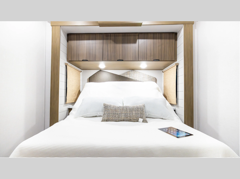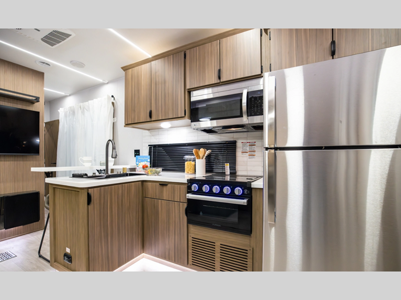 Sleeps 3 Slides 2 Length 37 ft 9 in Ext Width 8 ft Ext Height 12 ft 8 in Int Height 7 ft Hitch Weight 1335 lbs Dry Weight 9234 lbs Cargo Capacity 2301 lbs Fresh Water Capacity 40 gals Grey Water Capacity 40 gals Black Water Capacity 40 gals Available Beds King with Versa Tilt Cooktop Burners 3 Number of Awnings 1 Water Heater Type Tankless AC BTU 15000 btu Awning Info 21' with 4K Blade Lighting Axle Count 2 Shower Type Walk-In Shower Similar Floorplans